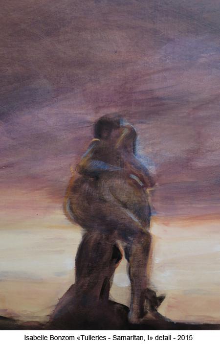 After her series of male nudes, Isabelle Bonzom has been dedicating for around five years a part of her work to the dramatic and symbolic power of statues in the urban scape. She has painted a series about a statue of the Poilu, the World War I soldier. In that series, the artist pays homage to all human beings affected by war and reflects on the place that a conflict such as World War I occupies today, not only in the urban landscape but also in people’s consciousness. Then, sculptures of male nudes at the Tuileries garden have appeared in new paintings. South Korean art critic and curator Gabino Kim, also art historian expert in theology, gives his insights about a painting of that series, " Tuileries - Samaritan, I".