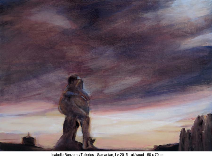 The streaming air fluctuates to tangle with two people. Half-dead, stained by injuries, one of them has been raised up by the other. Heaven decides to change the color of His own face. This artwork which is concerned by the sensations of the viewer is "Tuileries - Samaritan, I" by Isabelle Bonzom (1964~). Love and Pain are intertwined in this artwork which, through colours, dissolves them into unconditional love.